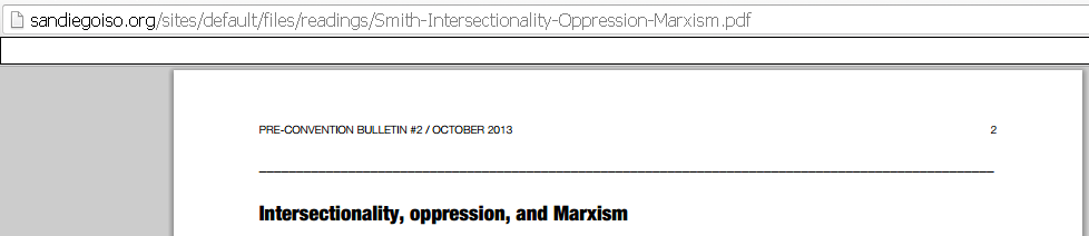 A comrade may object here that it is acceptable to publish internal documents after the Convention, but not before. But the leadership faction does not respect this “norm” either. For example, the San Diego branch of the ISO has published Sharon S’s document “Intersectionality, oppression, and Marxism,” which appears in Pre-Convention Bulletin #2 for Convention 2014. Here is the publicly-accessible link: http://sandiegoiso.org/sites/default/files/readings/Smith-Intersectionality-Oppression-Marxism.pdf. This link is published on the public Facebook event page for the branch’s Marxism Day School on December 7; the article is required reading for the second session. (Below I have provided screenshots, in case someone decides to take down the links.)